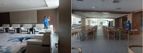 施工第1道:完全分解空氣中游離態(tài)污染物,采用方法:全空間霧化技術(空調(diào)新風窗戶需關閉)。
