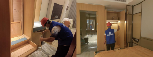 施工第3道工序:對(duì)細(xì)小家具、抽屜、床墊、木制鑲嵌柜子進(jìn)行除味工作,確保異味明顯降低,無刺激異味(人員可以正常進(jìn)出)。