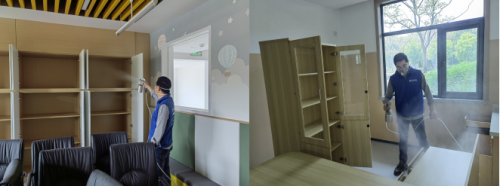 施工第1道:完全分解空氣中游離態污染物,采用方法:全空間霧化技術(空調新風窗戶需關閉)。